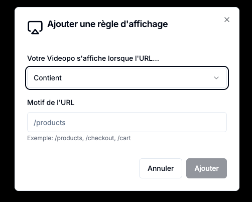 L’affichage d’une vidéopop est définie en fonction de l’url sur laquelle vous choisissez de la faire apparaître. Cette boîte de dialogue vous aide à définir des règles du type: