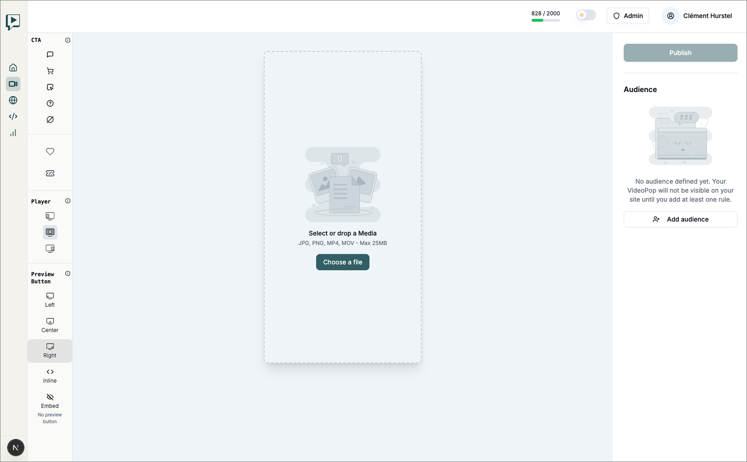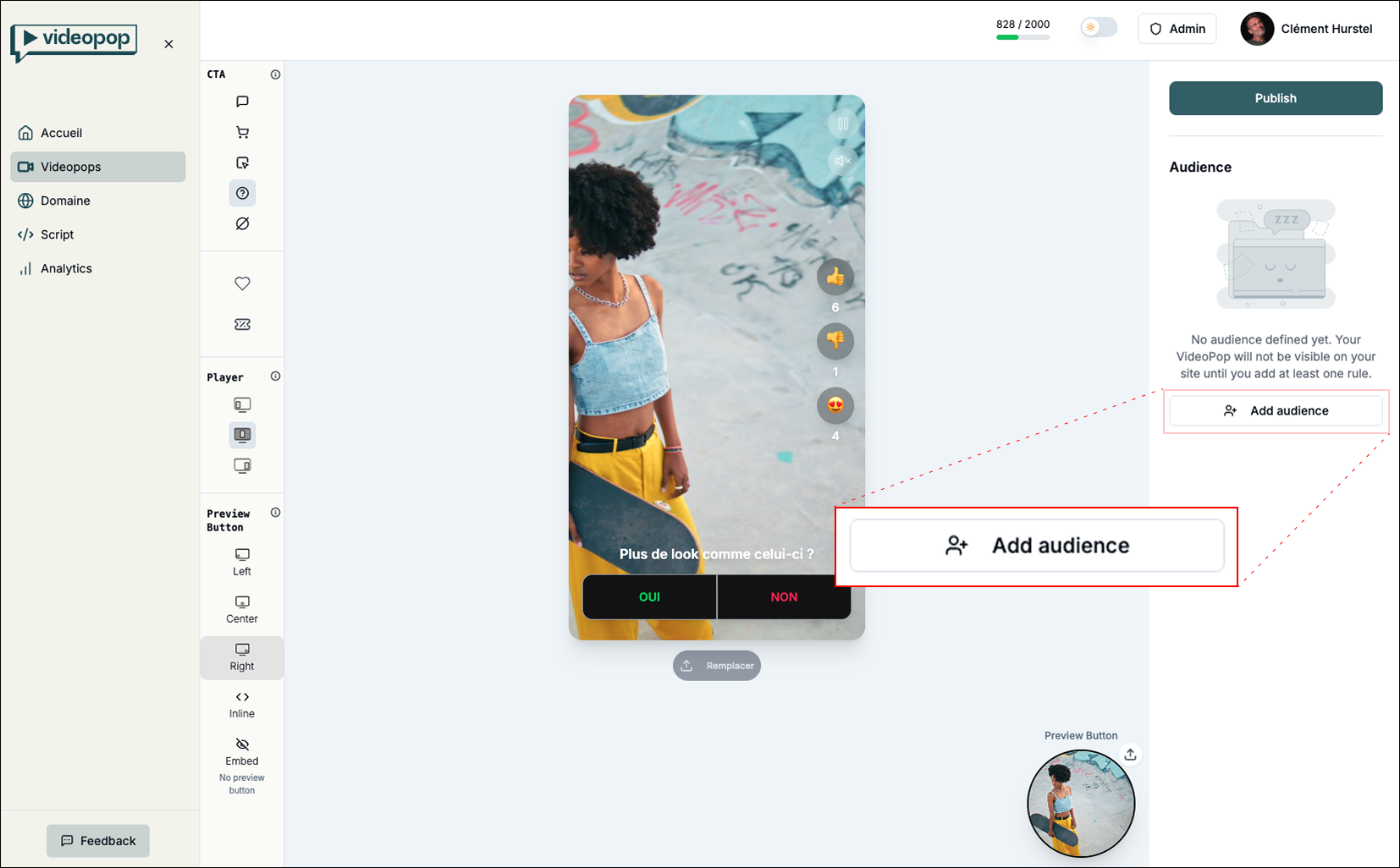 Pour cela, vous allez ajouter une audience à votre Videopop en cliquant sur le bouton “Add audience” à droite de votre écran pour définir les règles d’affichage de votre vidéopop.