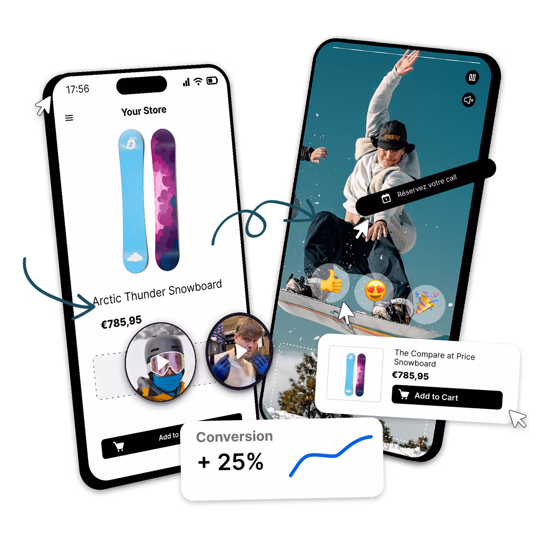 Avec VideoPop, vous pouvez déployer le video ecommerce à différents points de contact : fiches produits pour la conversion, pages collection pour la découverte, ou pop-ups pour l'engagement. Chaque format est optimisé pour son contexte.